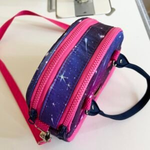 Feita em tecido tanto na parte externa quanto no forro, possui dois compartimentos separados e com fechamento de zíper. Possui alça de mão e alça lateral removível.