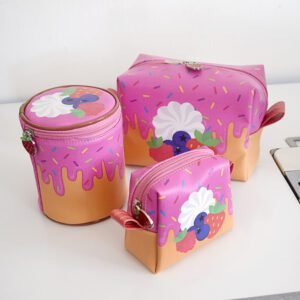 São 3 necessaires de tamanhos diferentes. Todas feitas em material sintético que imita couro na parte externa e com forro plástico para facilitar a limpeza.
