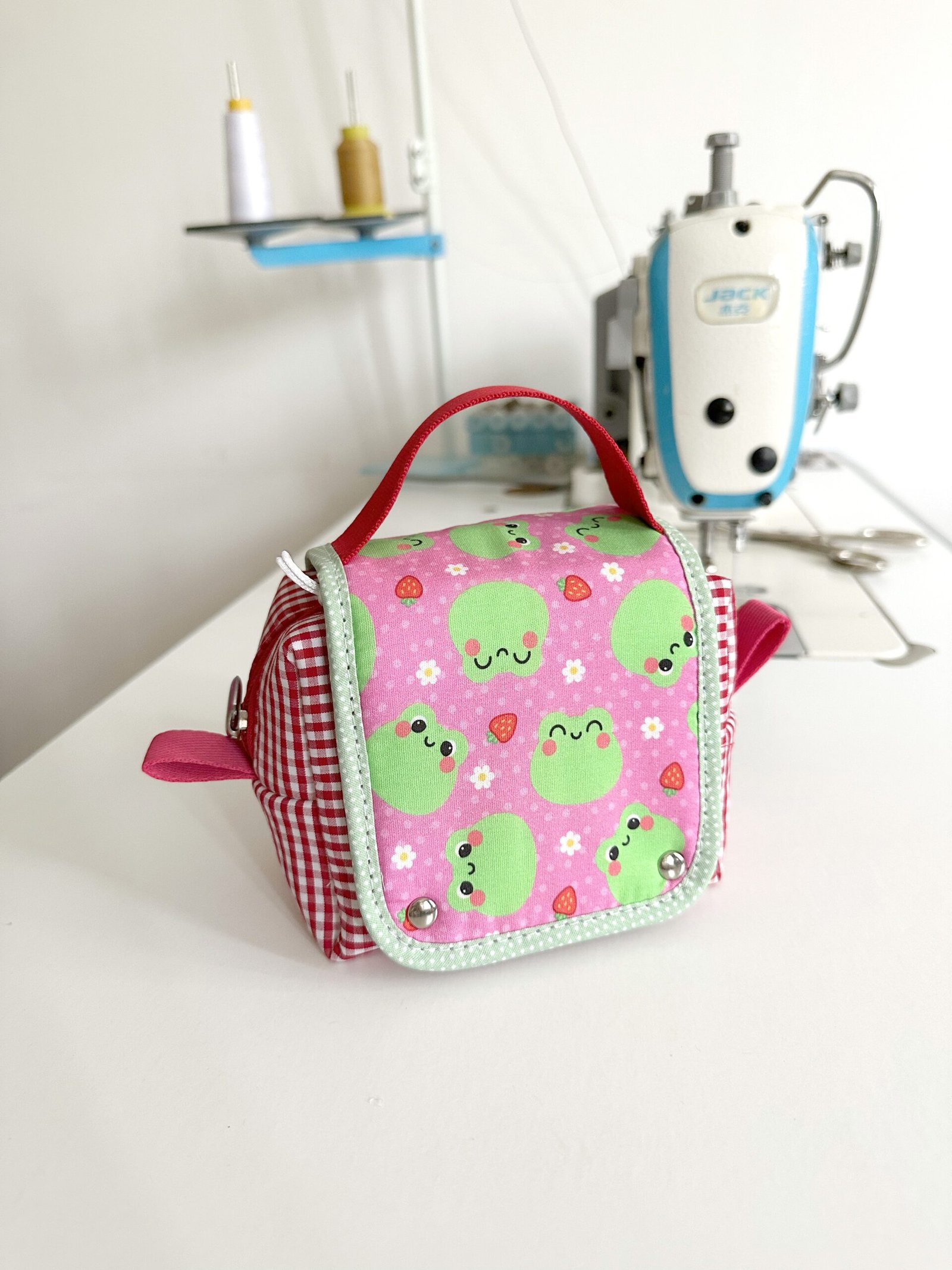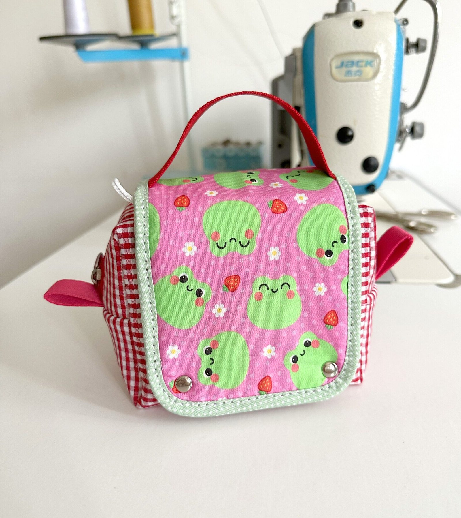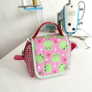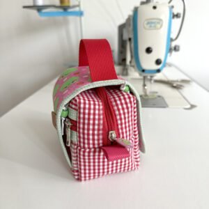Toda feita em tecidos estampados, com alça pra carregar e fechamento de botão magnético.