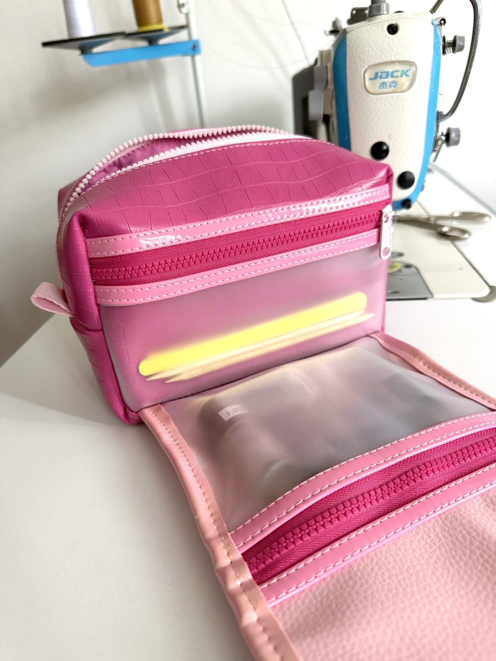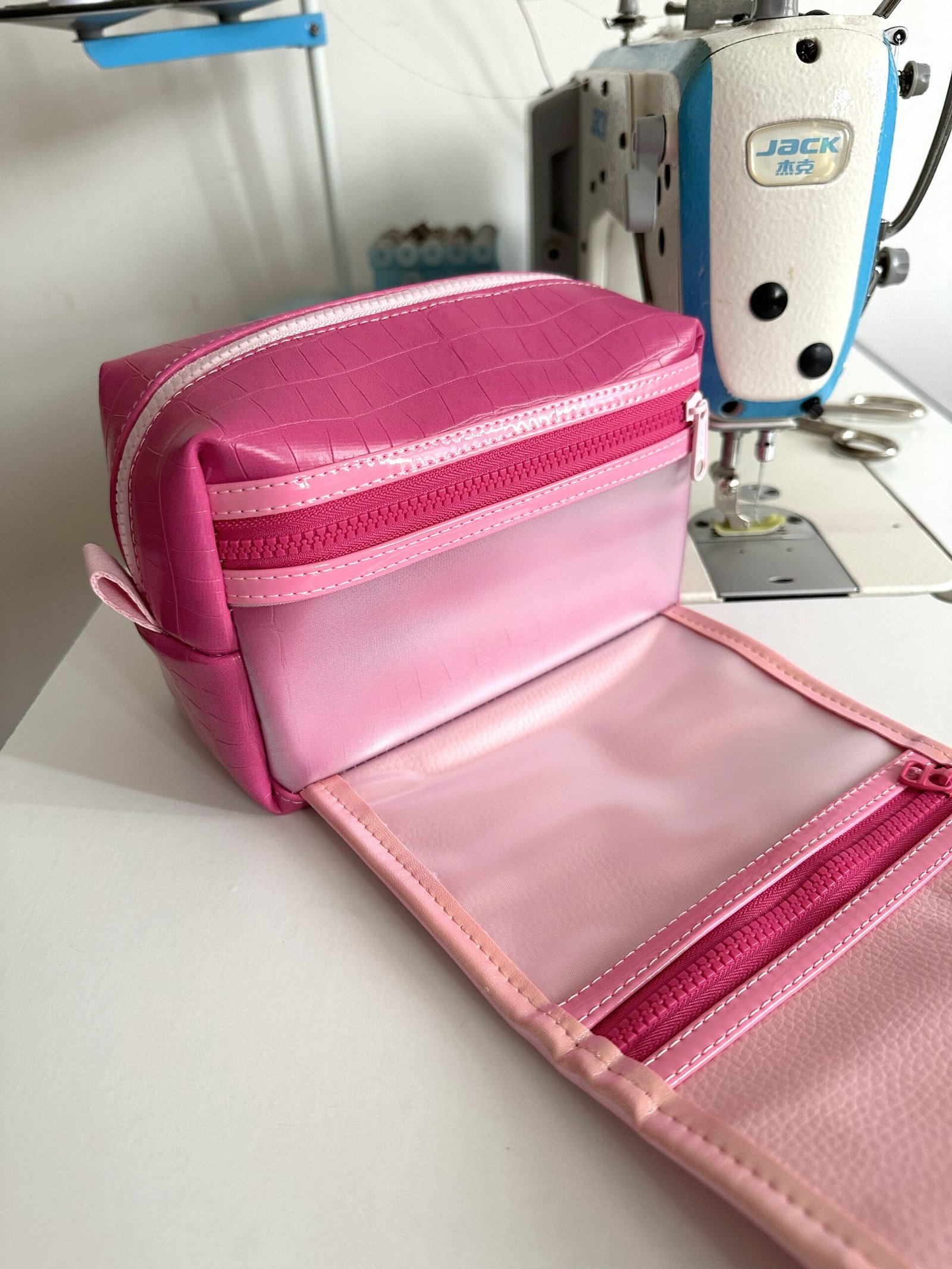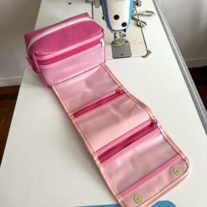 Esse modelo possui uma necessaire básica no formato box, com um bolso plástico na parte de trás + uma aba grande com dois bolsos com fechamento de zíper.Com alça pra carregar e fechamento de botão magnético.