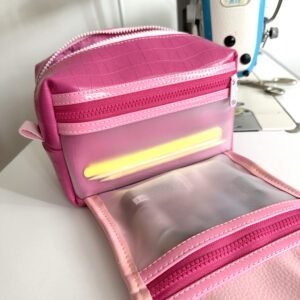 É uma peça muito espaçosa e feita com material sintético que imita couro. Na parte interna é feita com material plástico pra facilitar a limpeza.